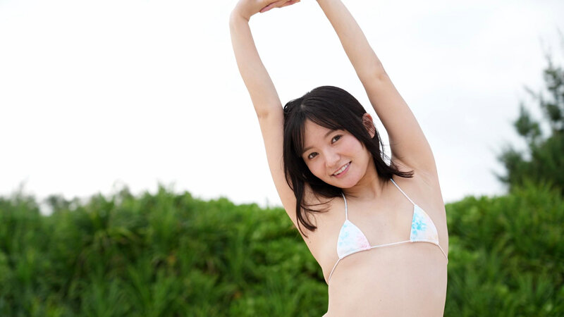 冒頭は砂浜で白いビキニ姿で登場。